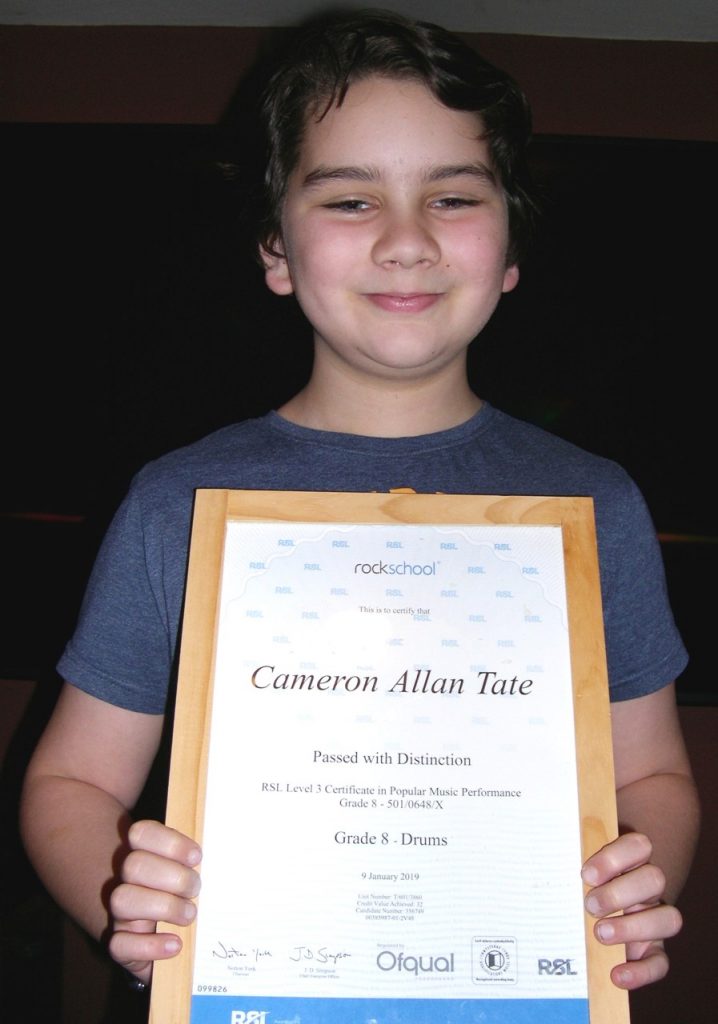 Huge congratulations go to Alex’s 10 year old student Cameron, who achieved a distinction in his GRADE 8 drum exam – fantastic Cameron well done!!